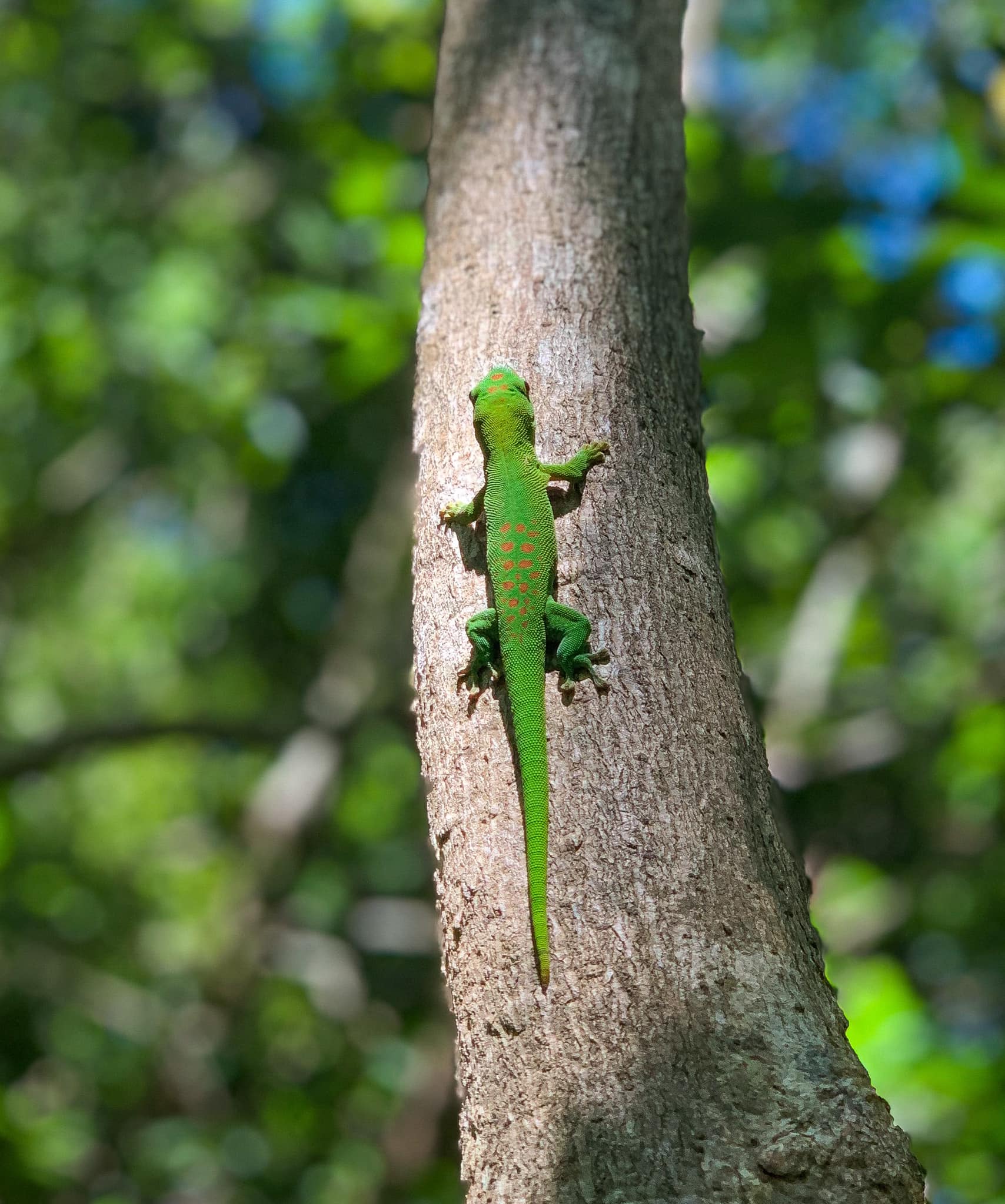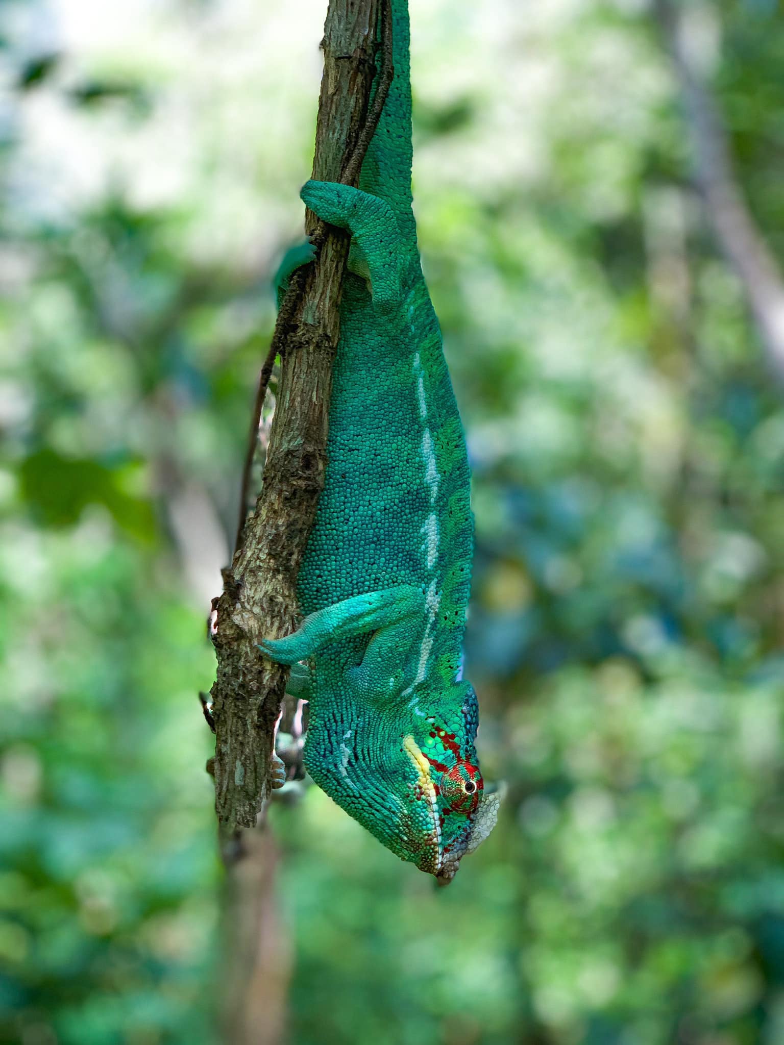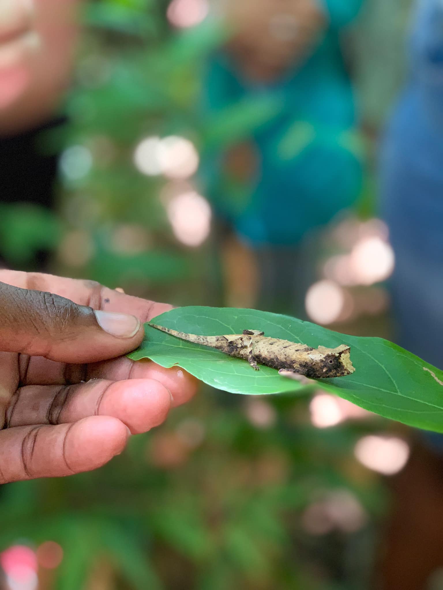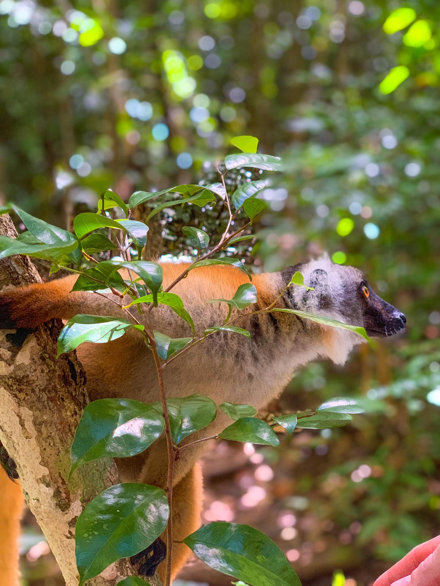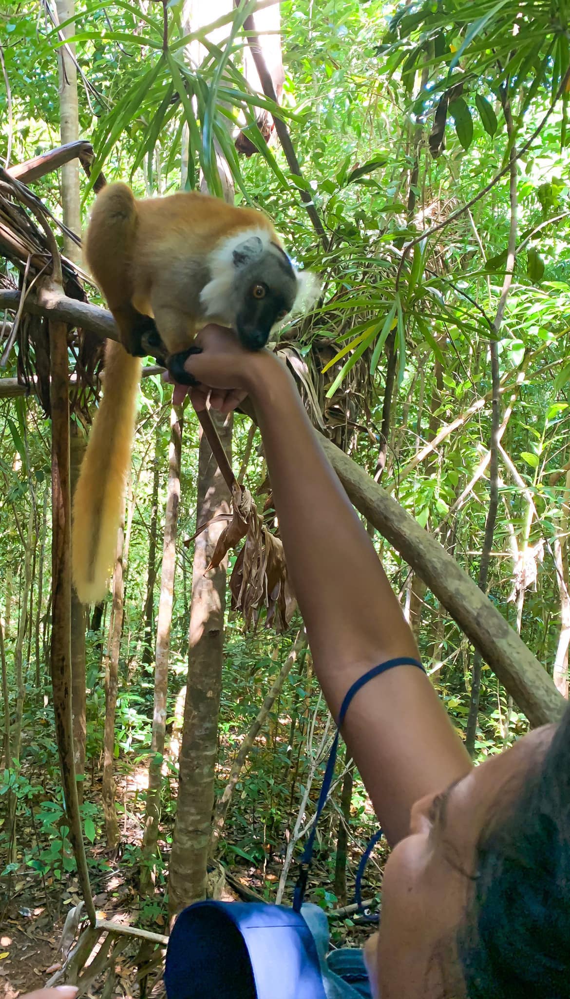 Lors de la balade sur l’île nous avons l’occasion de nous laisser approcher par les lémuriens, notamment le lémur macaco. Pour qu’ils s’agrippent à nous, nous leur donnons des bananes, ils adorent çà! Mais attention, il est interdit de mettre de l’anti-moustique sur vous car les lémuriens pourront manger dans vos mains. A votre arrivée, on vous donne une huile à la citronnelle pour vous protéger.   Nous avons également l’occasion de croiser d’autres animaux: des tortues, serpents, caméléons …
