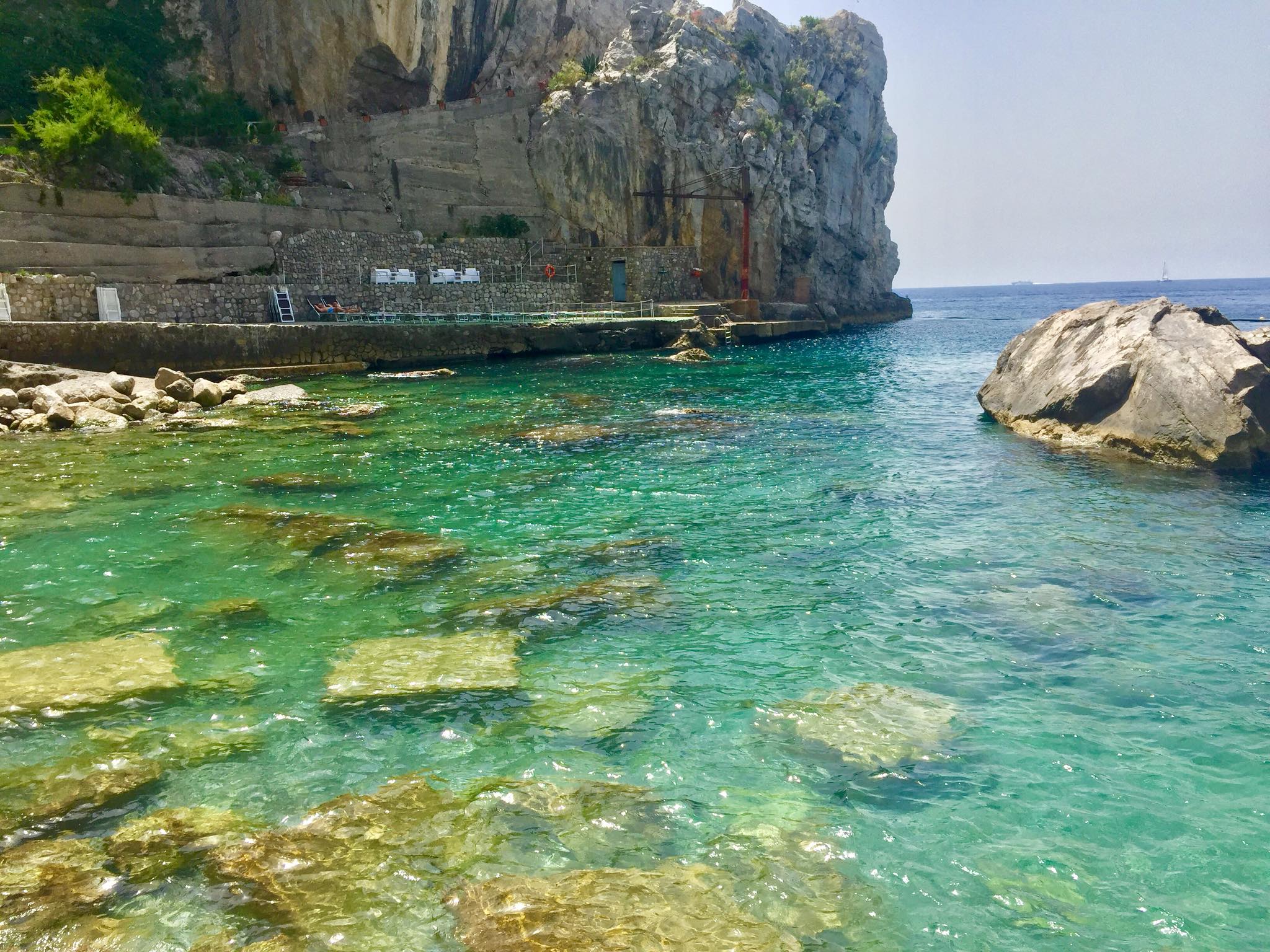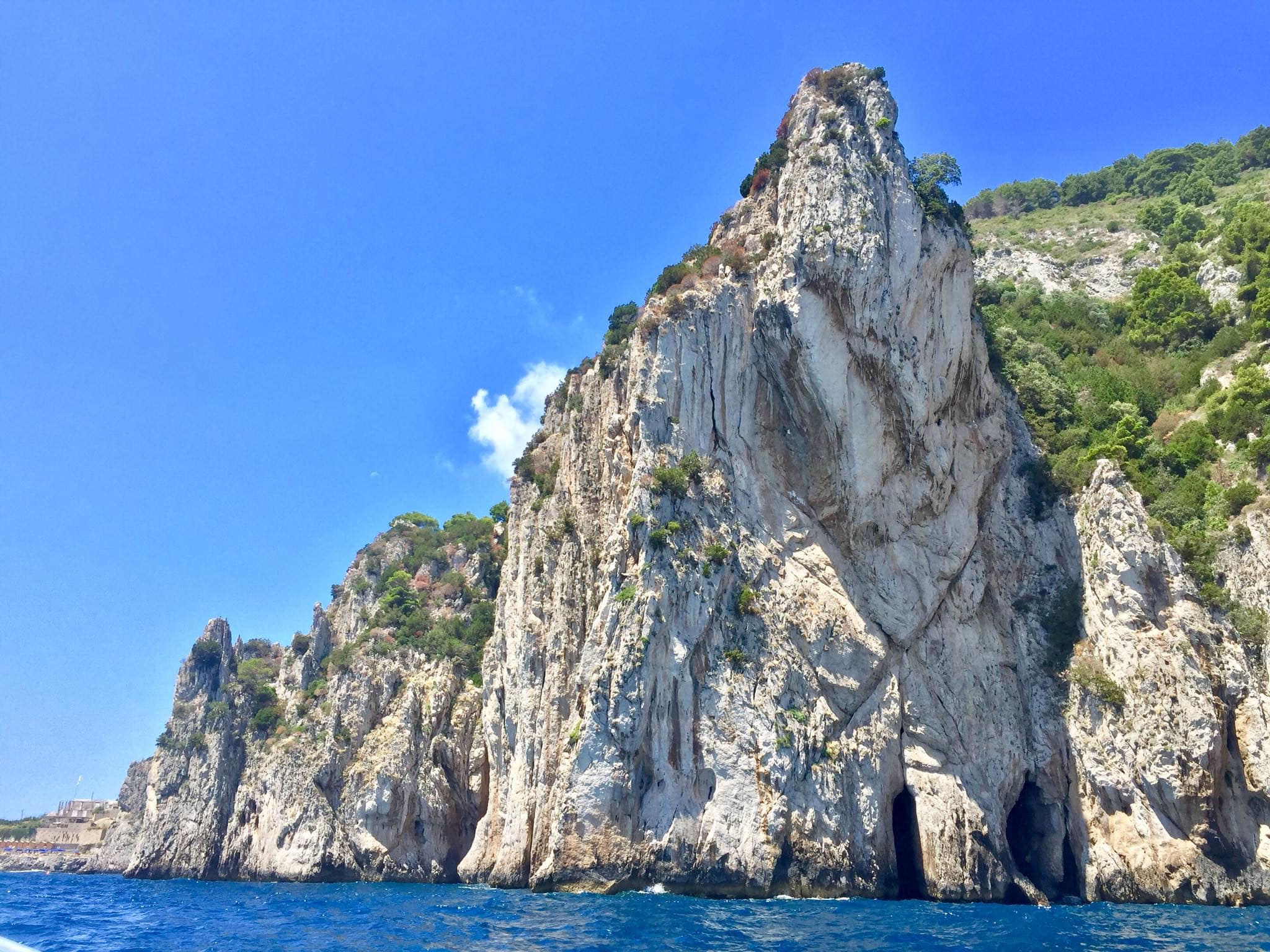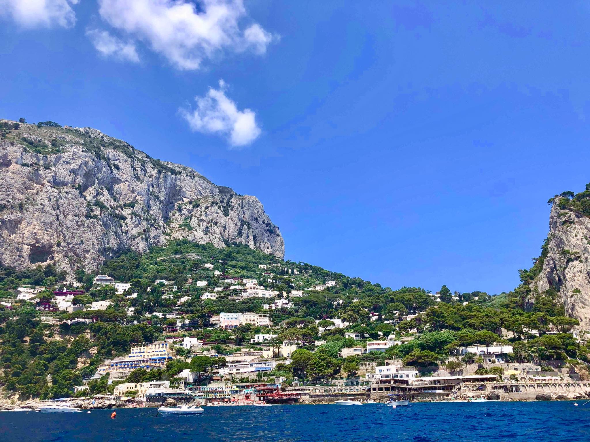 A notre arrivée sur l’île de Capri, des loueurs de bateaux sont venus vers nous,  nous proposant de louer un bateau sans permis et de faire le tour de l’île. L’idée nous a tout de suite intéressée. C’était une belle façon de commencer la visite. Nous voici un quart d’heure plus tard sur notre petit bateau à aller sillonner les recoins de cette charmante île. Sur votre chemin, admirez les magnifiques yachts. Nous avons même pu jeter l’encre dans une petite baie et profiter d’une baignade dans une eau limpide. Quel beau souvenir ! Dans la baie, ne manquez pas de visiter la Grotte Azzua : à l’intérieur de cette grotte géante (54m de profondeur), la lumière bleue est éblouissante.